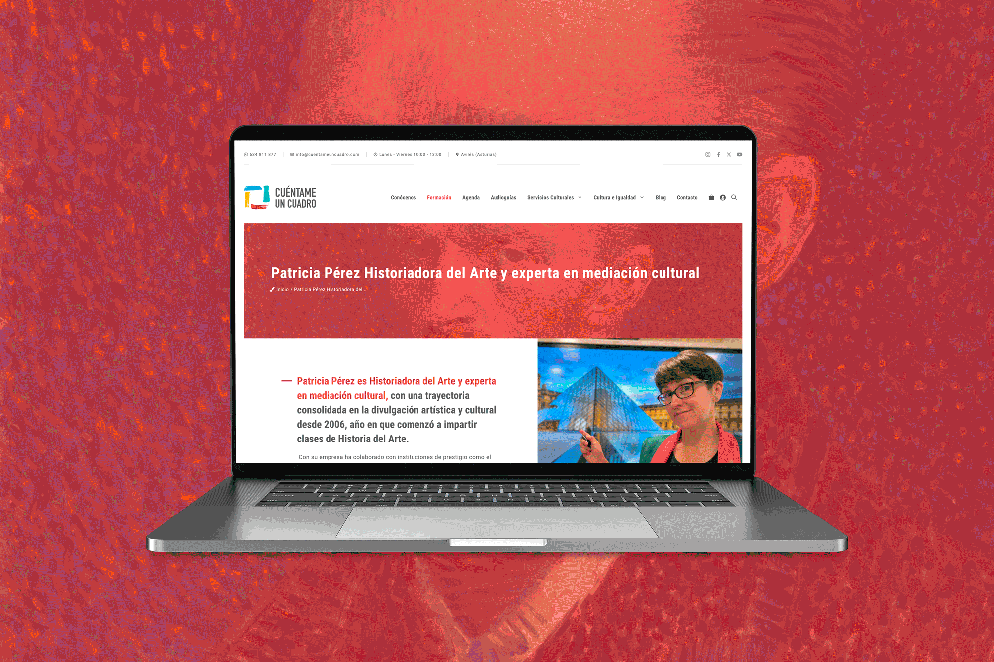 Empezamos por lo esencial: responder de forma directa a la pregunta que abre la web, “¿Qué es Cuéntame un Cuadro?”, y situar a Patricia como creadora y directora del proyecto. Desde ahí construimos una arquitectura de contenidos sencilla y lógica: Conócenos, Formación, Audioguías, Agenda, Servicios Culturales, Cultura e Igualdad, Blog y Contacto.